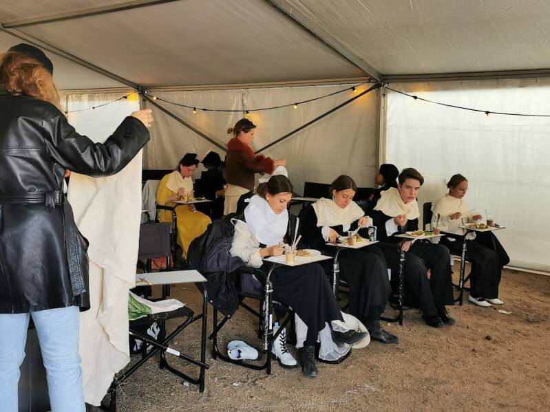Hieronder een typische lunch tijdens een Filmopname. De overdreven sjawls zijn bedoeld om de kostuums te beschermen tegen etensvlekken. In sommige gevallen worden er ook plastic mouwbeschermers ter beschikking gesteld.